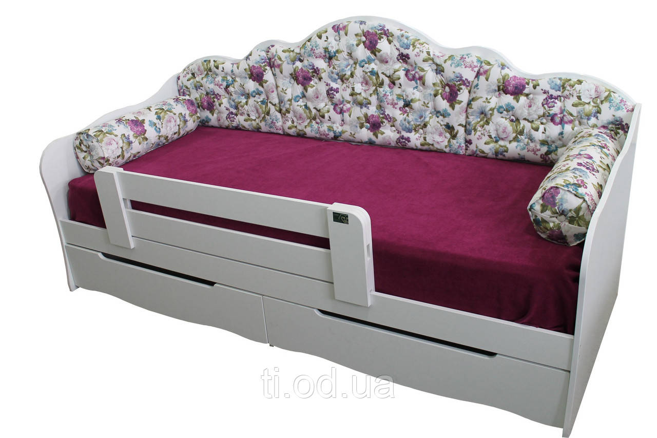 Дитяче ліжко-тахта з шухлядами для білизни і декоративним 3D візерунком на фасадах. Каркас ліжка, узголів'я і ізножье виконані з ламінованої ДСП товщиною 16 мм, Фасади ящиків, царга і спинка виготовлені з екологічно чистої плити МДФ 16 мм, покриті плівкою ПВХ, що захищає поверхні ліжка від подряпин і ударів. Ящики для зберігання на телескопічних направляючих. Можлива установка бортика (1300х400 мм).