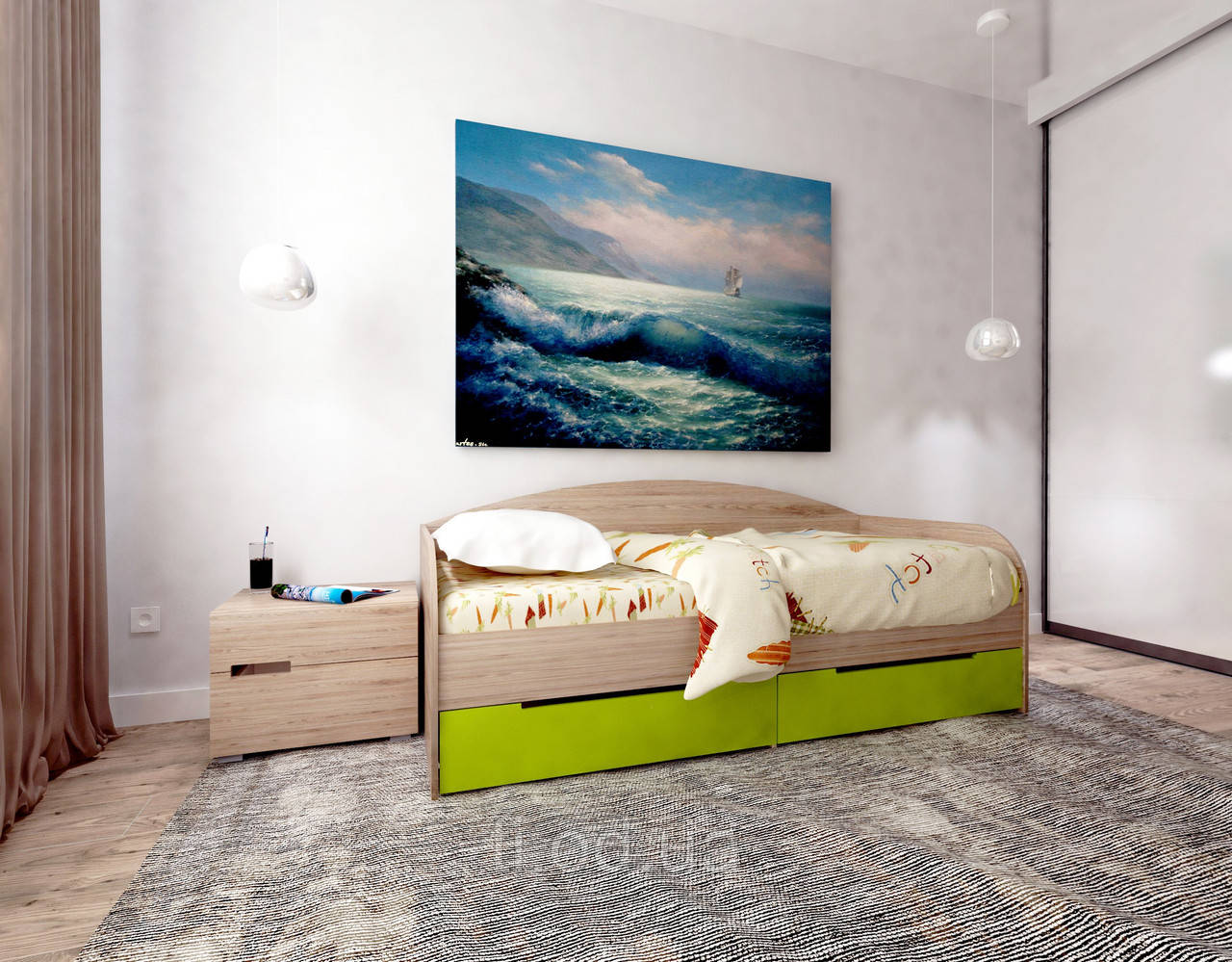Дитяче ліжко-тахта з шухлядами для білизни і декоративним 3D візерунком на фасадах. Каркас ліжка, узголів'я і ізножье виконані з ламінованої ДСП товщиною 16 мм, Фасади ящиків, царга і спинка виготовлені з екологічно чистої плити МДФ 16 мм, покриті плівкою ПВХ, що захищає поверхні ліжка від подряпин і ударів. Ящики для зберігання на телескопічних направляючих. Можлива установка бортика (1300х400 мм).